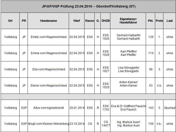 | 23.04.2016 (Reserve 24.04.2016) | Jugend- und Anlagenprüfung, Erweiterte Anlagenprüfung Raum Voitsberg, Stmk. Die Prüfungen werden gem. den Bestimmungen der Jagdlichen Prüfungsordnung 2010 des ÖJSpK abgehalten. | Ergebnisse |