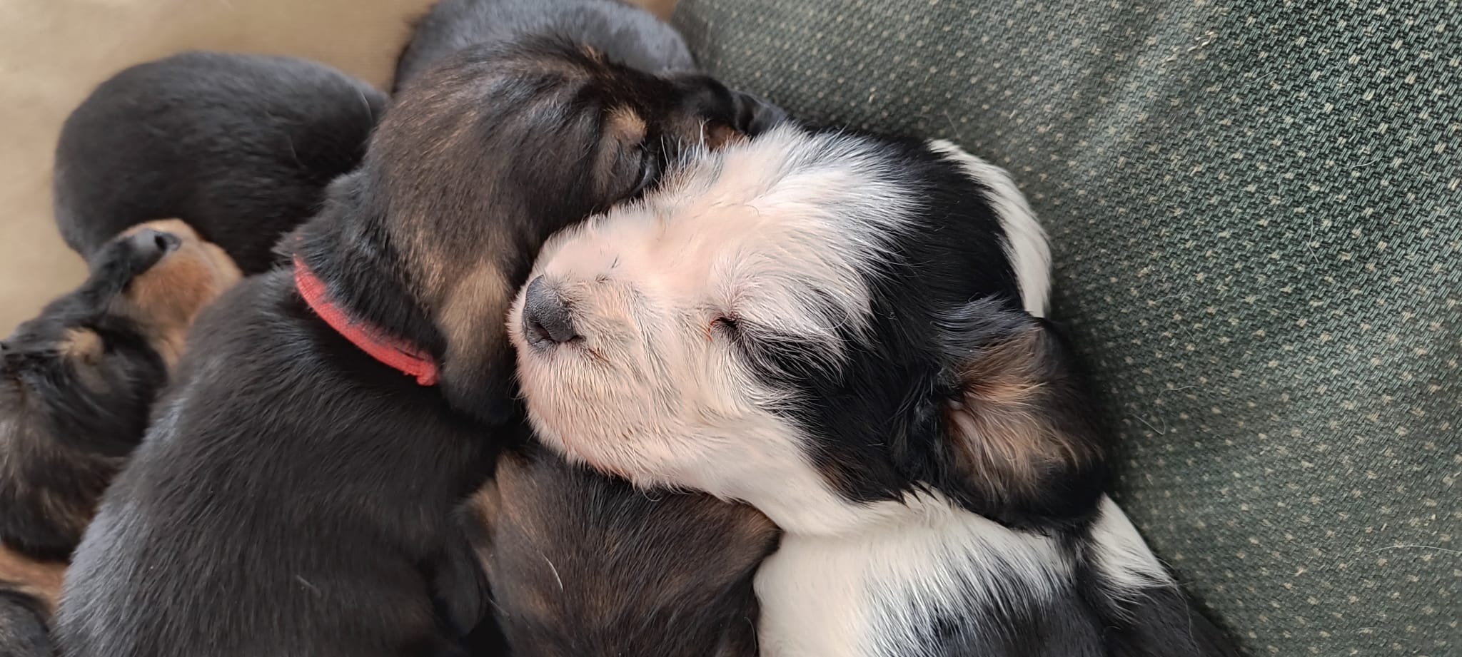 | Die Vorgeschichte: 7 süße Rauhaardackel-Welpen haben ihre Mutter verloren und zwei neue Mütter gefunden. |