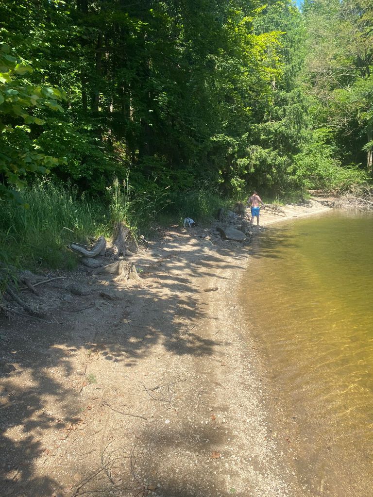 Ah verstehe! Ihr geht in das Wasser rein. Ich setze mich erst ins Gras in den Schatten und schaue euch einmal zu, wie das weitergehen soll.