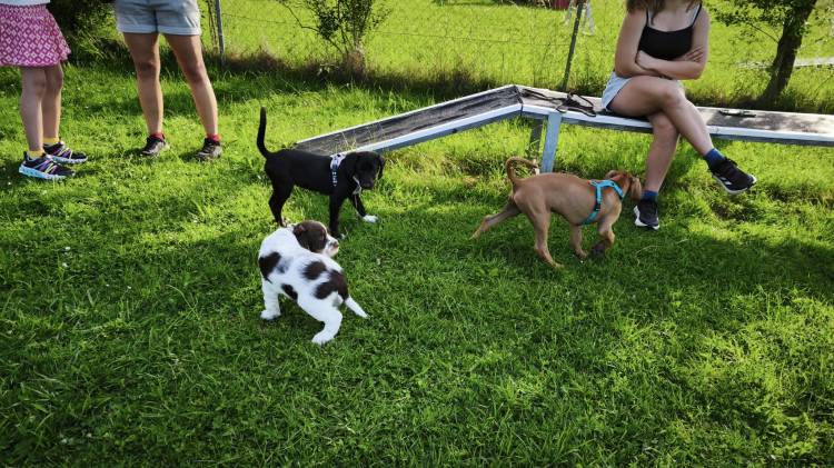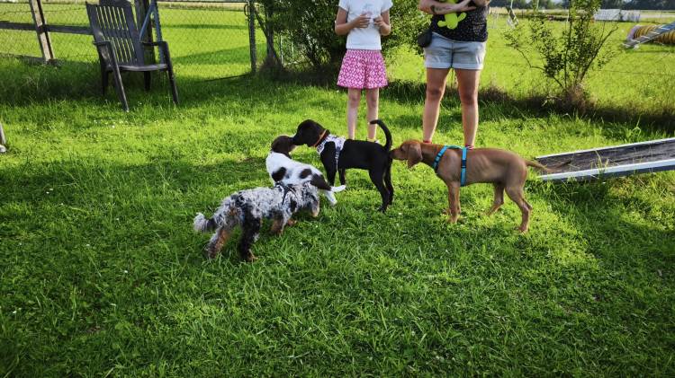 Ganz was Neues! Habt ihr das gewusst, ich habe sogar eine Tante. Sie heißt Georgina und sie spielt auch mit mir. Naja, nicht so schön wie Mama und meine ganze Familie, aber immerhin. Sie kennt mich ja auch nicht so lange. Das muss ich euch aber auch noch erzählen: Ich war in der Hundeschule! Dort sind viele Menschen, ihr wisst schon wen ich meine. Diese riesigen Lebewesen und sie haben auch andere Hunde mitgebracht. Die sehen ja ganz anders aus, ganz anders als Mama oder Tante Georgina.