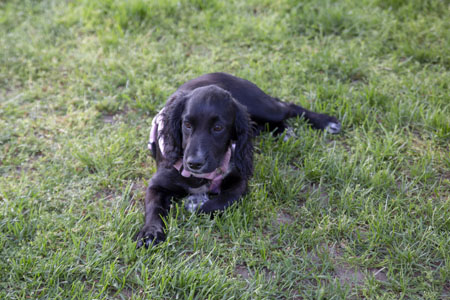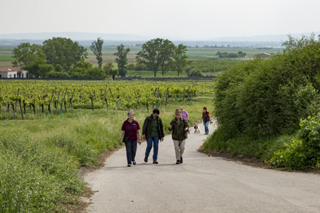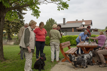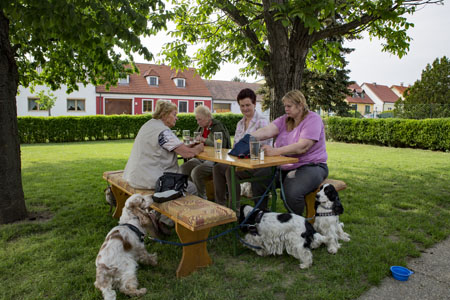 … die Spaniels wandern in den Weinbergen. Obwohl der Mai wettermäßig in diesem Jahr schon im April begonnen hatte, hat er uns doch auch heuer nicht enttäuscht. Daher trafen wir frohgemut beim Bayerkeller in Feuersbrunn ein. Wir wollten diesmal ein etwas größeres Ründchen durch die Weinberge drehen. Die Wege waren zwar trocken, aber trotzdem fand so mancher Hund ein „Gatschloch“ in dem er sich nach Herzenslust panieren konnte. Bald hat uns die Sonne gut gewärmt, und so spielten wir das Spiel von den „10 kleinen Negerlein“. Bei jeder Abzweigung verließ uns ein Wanderer, um zum Bayerkeller zurückzuwandern. Auch meine Seniorin Evita durfte mit „Papa Franz“ im Spanielmobil zurückfahren.