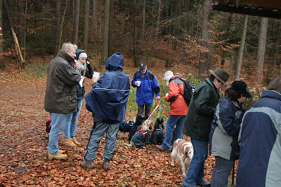 Erfreulicherweise kommen unsere Teilnehmer von Jahr zu Jahr pünktlicher und so konnte von Karlstetten nach Heitzing schon vor 14 Uhr abgefahren werden. Nach einem kurzen Wegstück entlang der Straße mit Leine konnten ab der Waldgrenze – Dank unseres Jagdleiters und Revierbesitzers Franz Marchart und seines Sohnes Roman – ohne Leine, zur Freude der Hunde und ihrer Besitzer, frei laufen. Aber eigenartiger Weise, wenn sie dürfen laufen sie gar nicht wild durch Wald und Flur. Sie sind sich anscheinend ihrer „hohen Geburt“ als Jagdhunde bewusst und bleiben bei der Menschenschar. Heuer waren es, bedingt durch krankheitsbedingten Ausfall einiger Menschen und Hunde, 25 Zweibeiner und 22 Vierbeiner die bei der Bildföhre im Dunkelsteinerwald ankamen – natürlich auch nachher im Gasthaus – da gab es keine Ausfälle.