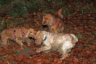 Während sich die Menschen unterhielten und die Köstlichkeiten genossen vergnügten sich auch die Hunde, hier besonders unsere Jungspunde. Leider durfte da unser „Julio“ nicht mit spielen – obwohl er’s gerne getan hätte – Frauchen befürchtete, dass der überwiegend weiße Cocker, seine „Grundfarbe“ ändern würde!