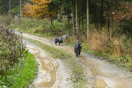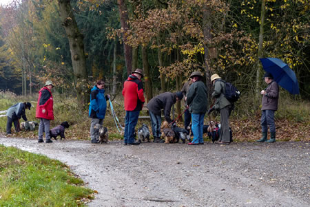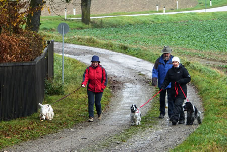So arg war’s heuer nicht, es regnete nur leicht um am Heimweg ganz aufzuhören. Ja teilweise blinzelte sogar die Sonne durch die Wolken. Die Menschen (22 an der Zahl) waren gut bekleidet, die Nässe kam eher von innen. Durch die eher warmen Temperaturen schwitzte man eher. Den 22 Spaniels war das Wetter sowieso egal, Hauptsache sie durften sich frei bewegen und das konnten sie ausreichend. Dank dem sehr guten Verhältnis mit Jagdleiter und Grundeigentümern gibt es hier keine Probleme mit freilaufenden Hunden, noch dazu wenn sie gut erzogen sind.