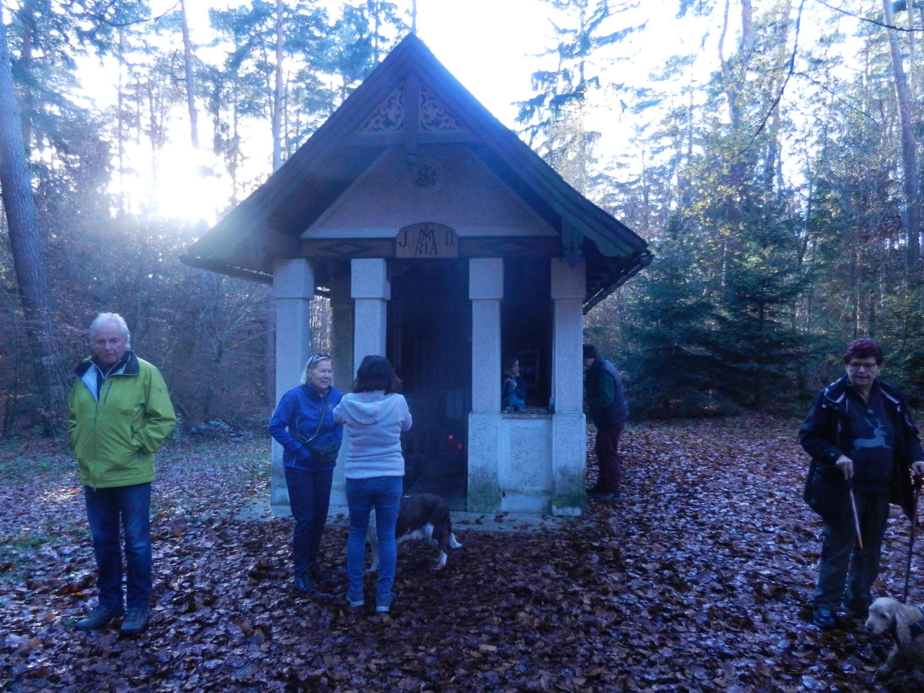 Bald tauchte auch zwischen den Bäumen die erste Station unserer Wanderung (Kapelle und Labestation) auf, wo Gabi schon ein „(B)bisschen“! was vorbereitet hatte, damit auch andere Körperteile, nicht nur unsere Beine trainiert wurden.