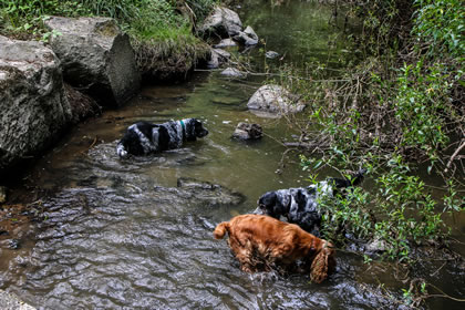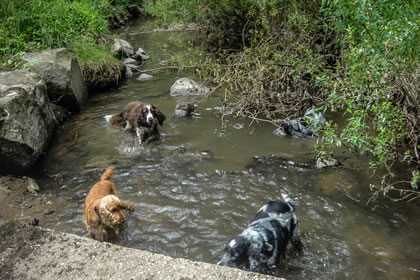 Nun zur Wanderung: Vom Feuerwehrhaus gingen wir um etwa 10:20 Uhr ein kurzes Stück auf der Strasse um dann rechts über einen Feldweg in das Jagdrevier von Dr. Gradwohl zu gelangen. Ab der Waldgrenze durften unsere Hunde frei laufen, Spanielherz was willst du mehr? Auf romantischen Wegen gingen wir durch Hochwald und Wiesen, teilweise am Waldrand, ein Stück an einem Bach entlang, dann vorbei an einigen Teichen durch die traumhaft schöne Waldlandschaft des Waldviertels. Das Wasser nützten natürlich unsere Spaniel weidlich aus. Trinkwasser für die Hunde mitnehmen braucht hier keiner mitnehmen, es gibt Wasser genug in der Natur. Klar ist es im Waldviertel nicht immer flach, es ist ein ständiges Auf und Ab. Meine alten Füße spürten das leider und meine „Kondi“ war auch schon besser! Wenn von Zeit zu Zeit ein wenig Wind durch den Wald blies war es eine Wohltat, zumindest ich schwitzte extrem wegen der warmen Temperaturen. Ab er genug erzählt, lassen wir einmal die Bilder sprechen.