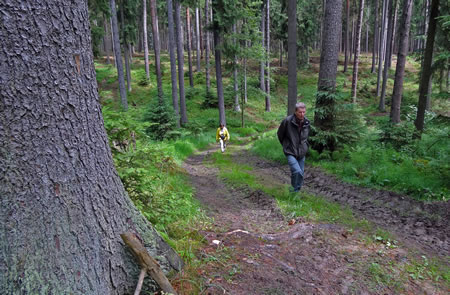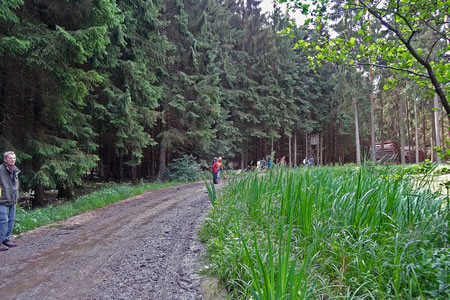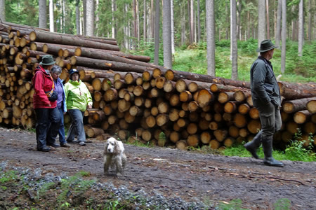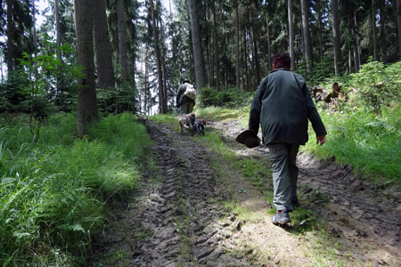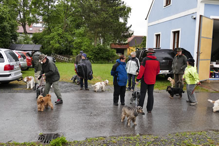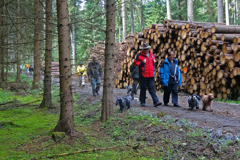 Nach und nach trafen die Wanderlustigen ein – und der Himmel verdunkelte sich. Es begann zu schütten! Warten oder gehen? Wir marschieren los – und anscheinend hatte Petrus ein Einsehen mit uns. Kaum dass wir Richtung Revier marschierten, besserte sich das Wetter. Die Hunde hatten ihren Spaß!