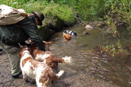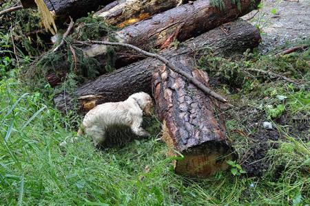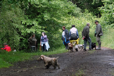 Während die meisten Spanielbesitzer noch starr vor Schreck am Ufer standen, reagierte Dr. Gradwohl sofort und watete ohne zu zögern, in voller Montur in den Teich und zog Balu heraus. Uff! Das ist ja noch einmal gut ausgegangen. Triefend naß kam Balus Retter aus dem Teich und setzte so seine Wanderung fort. Vielen Dank im Namen aller Mitwanderer für dieses couragierte Eingreifen! Und was lernt man daraus? Beim Schwimmen soll der Hund „nackt“ – also ohne Halsband oder Brustgeschirr sein!