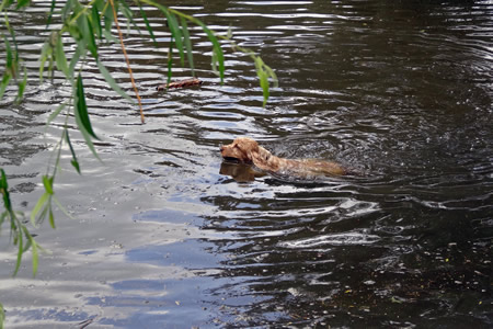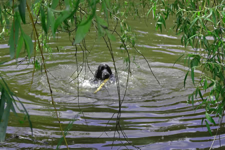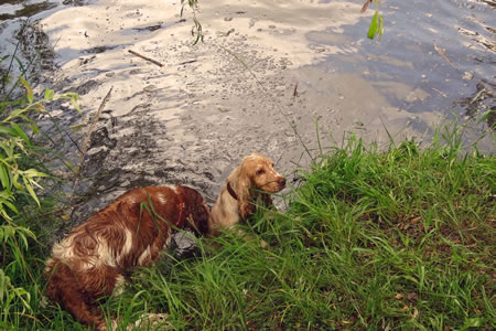 Beim Teich testeten ein paar Spaniels ihre Schwimmkünste. So auch Balu von Erny Zich. Doch plötzlich ruderte er verzweifelt an der Stelle und kam nicht weiter! Der Arme hatte sich mit seinem Brustgeschirr irgendwo verfangen und steckte fest!