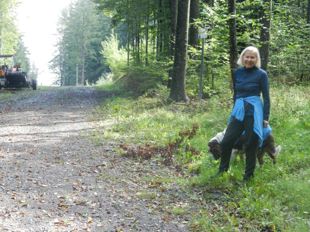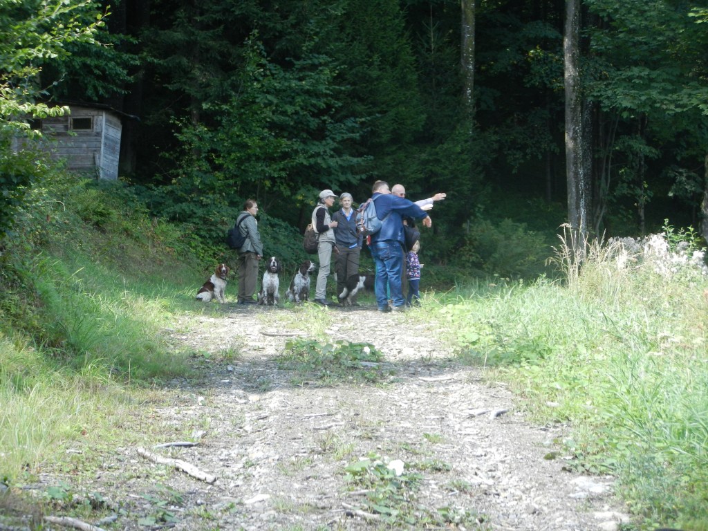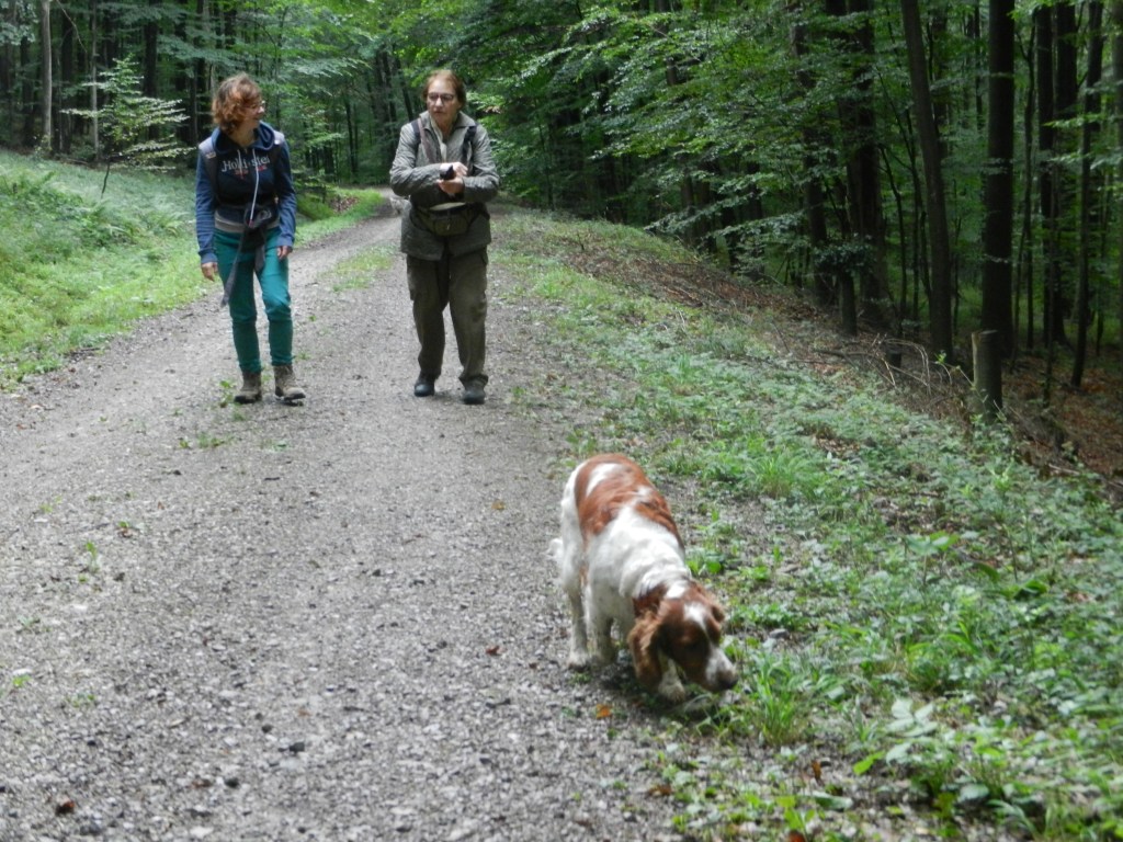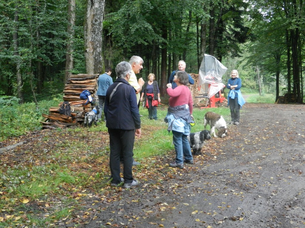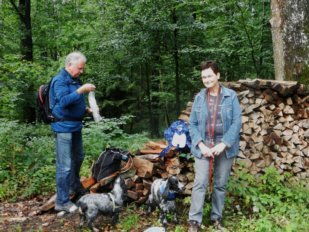 Bald bildeten sich Grüppchen, vorwiegend (aber nicht nur) wurde über Hunde gesprochen. An der Stelle (hinter einem Holzstoß), wo Gabi einen Rucksack mit Getränken versteckt hatte, sind wieder alle zusammen gekommen. Auch Heinz und Adrienne sind dort rechtzeitig eingetroffen.