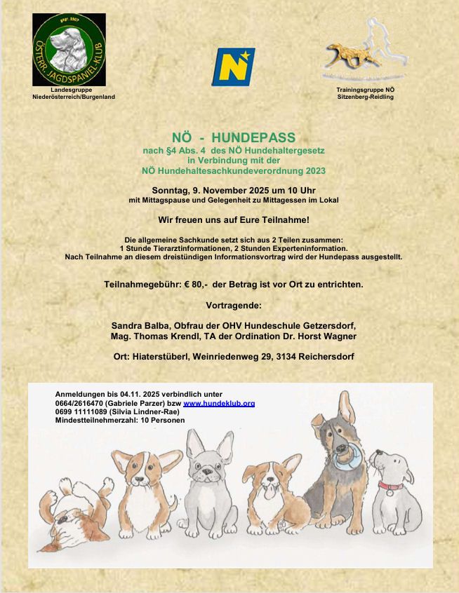 | 24.09.2023 10 Uhr | Sachkundenachweis für alle Hunderassen. Landstubn Riedrich, 3484 Grafenwörth | Details Anmeldung |