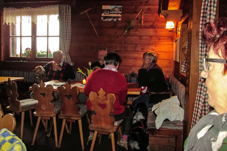 Anfangs war der Regen etwas mehr, ließ aber später etwas nach. „Nässeschäden“ von außen hatte ich keine, meine Feuchtigkeit kam innen vom Schwitzen. Feuchtwarmes Wetter ist nichtgerade meine Stärke. Nach etwa der halben Wegstrecke sahen Walter Hofbauer und ich unsere Mitwanderer schon weit vor uns, wir 2 gingen unseren gemütlichen Marsch aber weiter. Alter Mann ist kein Schnellzug! Oben trafen wir aber die anderen wieder. Zum Essen und Trinken bekamen aber aber auch noch genug. Bei diesem Wetter hatten sich außer uns nur noch 2 junge Leute auf die Sonnenalm „verirrt“. Gerhard, der Wirt spielte uns trotzdem auf der „Ziach’n“ (Ziehharmonika) auf und gab einige Witze zum Besten und verabschiedete uns mit einer Runde Schnaps. Fotos vom Weg gibt es wegen der Witterung keine, vom Innenleben bei der Rast schon.