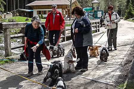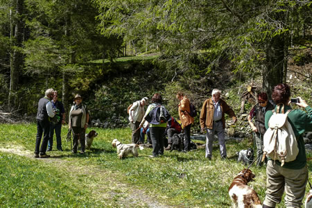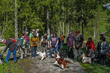Nachdem alle 21 Spanielfreunde mit 20 Spaniels am „Zechmannhof“ eingetroffen waren ging es am Morgen des 2. Mai um 10 Uhr mit den Autos ins Rohrmoser Obertal. Beim „Windbacher“ stellen wir unsere Autos ab und gingen gemütlich zur etwa 5 km entfernten „Wehrhofalm“. Wetter anfangs bedeckt, nach kurzer Zeit herrlicher Sonnenschein und sommerliche Temperaturen. Die Wetterfrösche irrten für diese Tageszeit wieder!