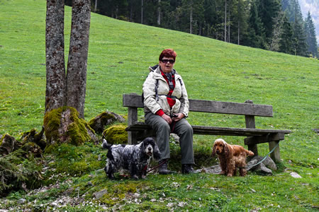 8 Spanielfreunde (mehr waren noch nicht da) machten sich am 1. Mai über Schladming ins Untertal, das „Tal der wilden Wasser“ auf um entlang des Untertalbaches sich für die kommenden Wandertage etwas „einzulaufen“. Hier muss ich gestehen ich tat mir dabei schon leichter, Alter und Gewicht tragen das ihre dazu bei! Vorne stürmten die Schnellläufer bergan, die Nachhut bildeten die Fußmaroden, Gerti Lukezic und ich, erreichten aber auch was wir wollten. Die Schnellen gingen bis zum Talschluss, mir genügte eine Bank wo meine Frau auf mich wartete.