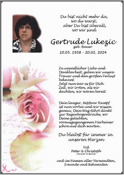 Du hast mit uns 35 Jahre die Liebe zu Hunden geteilt. Danke dafür und Farewell Gerti