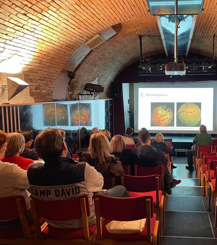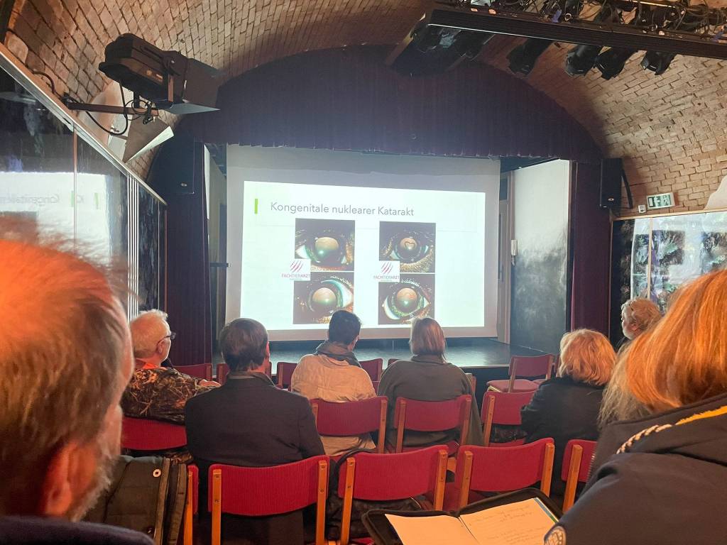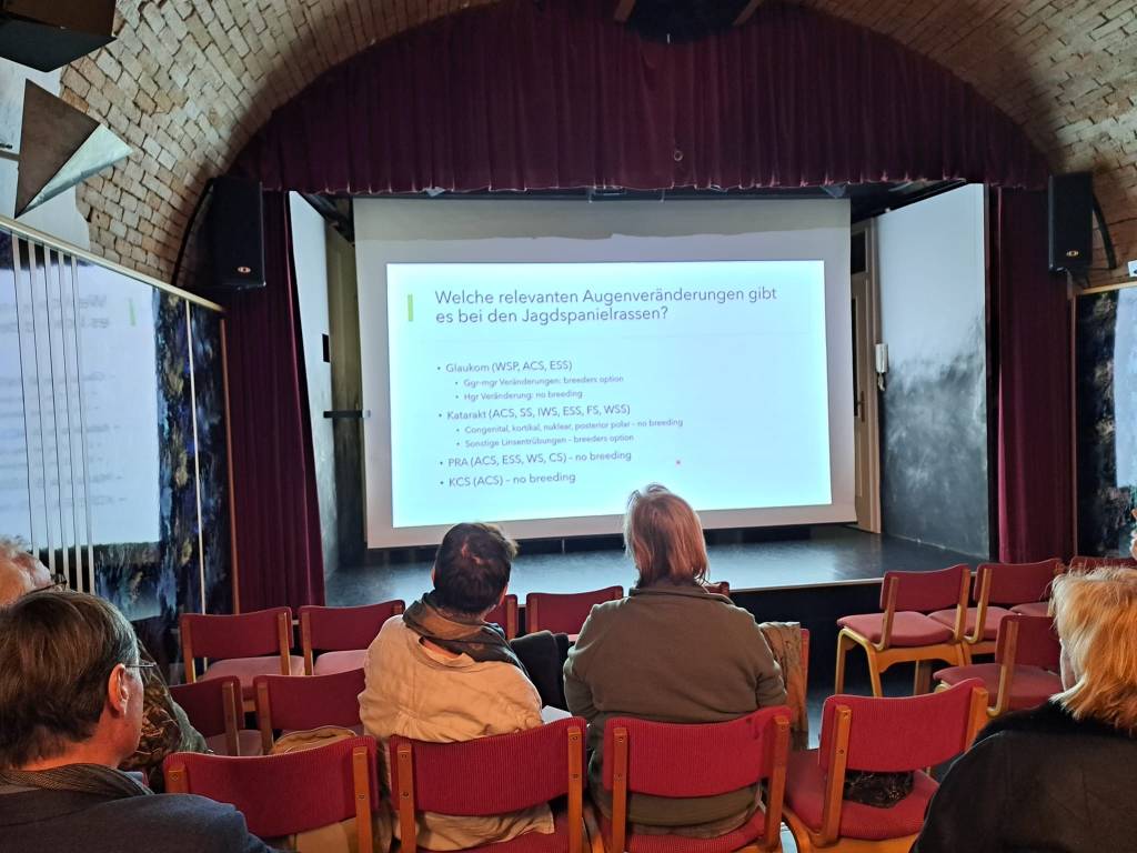 25 Personen trafen sich im Haager Theaterkeller, um sich an diesem Abend intensiv mit der Anatomie des Hundeauges, dessen Erkrankungen und deren Folgen und dem ECVO Untersuchungsbogen zu beschäftigen. Besonderes Augenmerk wurde natürlich auf die relevanten Augenveränderungen unserer Spanielrassen gelegt. Es wurde erläutert welche Diagnosen zuchtausschließend sind und welche der verantwortungsvollen Verpaarung durch den Züchter und dessen Zuchtverbänden obliegen. (breeders option)