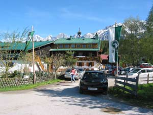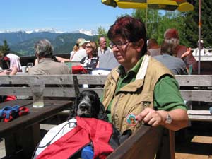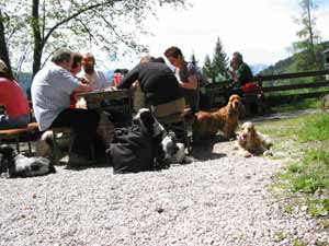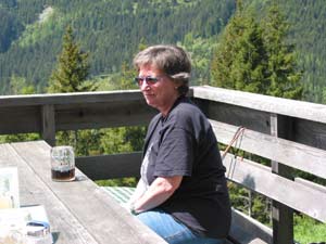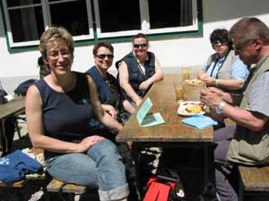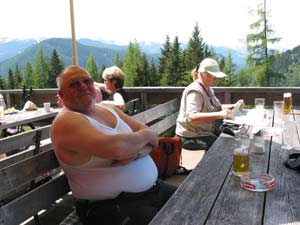 Zwar am Schluß aber nicht am Ende erreichten auch wir die „Ochsenalm“, von der Lage her ein wahres „Schmankerl“. Ein netter freundlicher Wirt, was Gutes zum essen und zum trinken, was will des Wanderers Herz mehr? Die Sonne schien warm auf die Terrasse, trotzdem saßen einige verschwitzt im Schatten, wo sie klarerweise nach einiger Zeit fror und sie vorzeitig aufbrachen. Scha