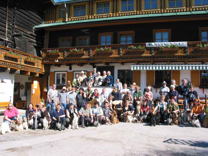 7 Uhr Tagwache, hinaus auf die Wiese mit den Hunden damit sie ihr „Morgengeschäft“ erledigen konnten. Heute ging das mit besonderer Freude, strahlender Sonnenschein und ungetrübter Blick auf den Dachstein im Hintergrund begrüßte uns schon in aller Früh. Lauter strahlende Gesichter schon beim „Frühsport“. Um 8 Uhr gings zum Frühstück, nachher fertig machen und „Fotografiergesicht“ für das Gruppenfoto aufsetzen. Um 1/2 10 Uhr war vor dem Zechmannhof Pressetermin mit Frau Weber von der „Ennstaler Woche“ einem Lokalblatt für diese Region. Frau Weber machte einige Fotos für ihren Bericht, selbstverständlich auch ich für meinen, und ein großes Gruppenfoto. Bis man soviele Spaniels und ihre Menschen „zusammenschlichtet“ dauert das schon eine Weile, das Ergebnis kann sich aber sehen lassen.