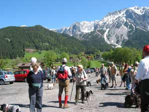 Um etwa 10 Uhr ging es in langer Kolonne (32 Autos incl. Führer) vom Zechmannhof weg. Um den Vordermann nicht zu verlieren hatten wir alle Fahrzeuge mit einem Aufkleber versehen damit man alle zur Kolonne gehörenden Autos leicht erkennt. Diese Aufkleber hatten wir auch schon 2003 erstmals verwendet, nachdem sich in Schleching viele Teilnehmer „verflogen“ haben.Für Treffelstein gab es ebenfalls ein spezielles „Pickerl“. So ausgerüstet gab es kein Problem alle Wanderwilligen nach „Ramsau Beach“ zu bringen. Außerdem fuhr unser Wanderführer Hans Stocker sehr zurückhaltend damit ja niemand die 1. Wanderung versäumt.