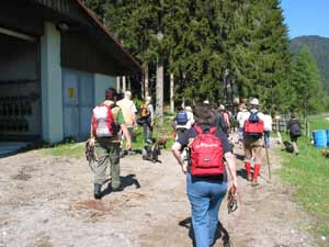 Wir am Ende des Feldes genossen, wenn auch, durch die Wärme an diesem Tag, schwitzend, die herrliche Gebirgslandschaft. Ich hatte Zeit der Familie Fuhrmann, Iris Kern und einigen anderen an der Landschaft interessierten Wanderern am Ende des Feldes – wir waren aber trotzdem keine „Zurückgebliebenen“ – zu erklären welche Gipfel wir hier sahen, welche Pflanzen am Wegesrand blühten. Ob das auch alle anderen ebenfalls mitbekommen haben? Den Wald und die Berge, die gute Luft – auch wenn man bergauf darum ringt – muß man genießen. Wir taten es!!!