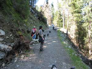 Zwangsläufig fange ich dann am Ende der Kolonnen, „bewaffnet“ mit 3 Leinen die „Rückkömmlinge“ wieder ein um sie irgendwann wieder an die Besitzer „rückzuerstatten“. Eine etwas mühselige Arbeit. Bei unseren NÖ Wanderungen kenn mich wenigstens schon die meisten Hunde und lassen sich fangen, hier war ich aber vielen fremd. Mit einfangen und telefonieren wem der Hund gehört war ich anfangs gut ausgelastet. Meine Bitte an Hans Stocker er möge warten bis wir aufgeschlossen haben um wieder Ordnung hineinzubringen wurde leider von vielen ignoriert, sie liefen weiter als er stehen blieb, also mußte er auch weiter gehen. Es ist ja auch ein Teufelskreis, die Ersten rennen weil sie es immer eilig haben (warum eigentlich?) die Nachkommenden müssen rennen weil sie sonst den Weg verlieren. Den „Lumpensammler“ spiel‘ dann meistens ich!