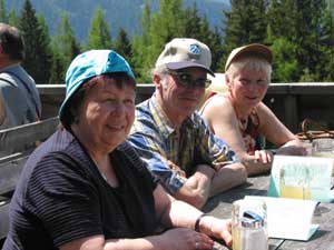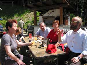 Nach dem Mittagessen tranken noch einige, ich war auch dabei, in der Almhütte ein vom Wirt selbstgebranntes Schnapserl. Der wahre Genuß, wir hätten noch gerne nicht nur ein Schnapserl sondern auch noch die Sonne und die Aussicht genossen. Daraus wurde leider nichts, ein paar „Flüchtlinge“ hatten es schon wieder eilig, die „bezahlte Mittagspause“ war vorbei oder sie mußten zum Zug? Vielleicht hatten sie auch schon vergessen daß die Autos im Tal warteten und das die Abfahrt keinem Fahrplan unterliegt.