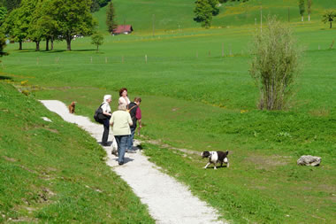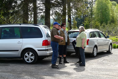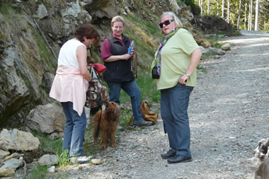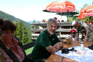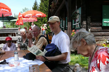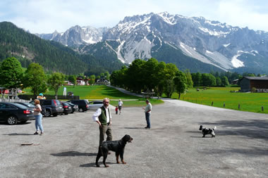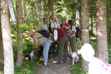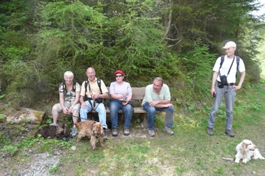 Da wir im Laufe des Donnerstags die Teilnehmer des Spanielwanderwochenendes erwarteten musste ich etwas früher als die anderen Wanderer wieder im Zechmannhof zurück sein. Ich führte daher den Konvoi bis zum Parkplatz „Ramsau Beach“ (Beach ist ein „echt steirisches“ Wort!) von wo der Abmarsch der Gruppe – heute wieder unter Führung von Hansi Stocker – war. Dann fuhr ich weiter bis zu einem dem Aufstieg näheren Parkplatz um bei der Rückfahrt etwas früher beim Auto und schnell beim Zechmannhof zu sein. Hans Kellner übernahm für mich die Fotoreportage, ein paar Bilder vom Weg und von der Ochsalm sind auch von mir.