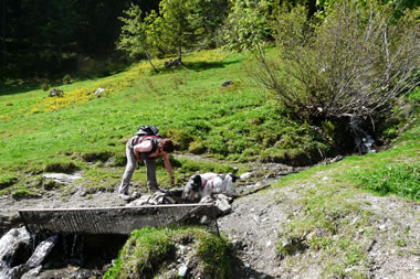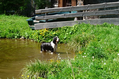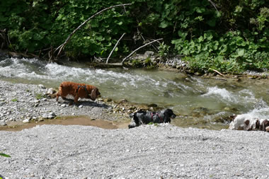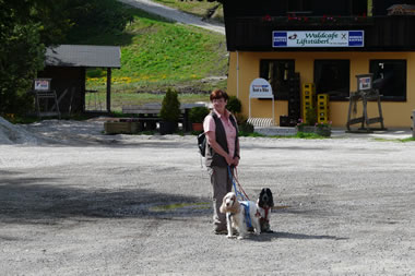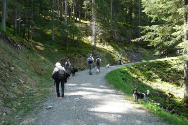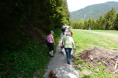 Der Wetterbericht dieses Tages sagte Hitze und Sonnenschein voraus, das traf auch ein. Glücklicherweise liegt der Aufstieg von der Stelle wo meine Frau, unsere 4 Hunde und ich weggingen überwiegend im Schatten. Dort war eine Gehzeit von 50 Minuten bis zur Ochsenalm angegeben. Diese Zeitangaben sind meist etwas vage um die Wanderer nicht abzuschrecken. Wir waren gespannt ob wir das in dieser Zeit schaffen würden. Ohne Gepäck und immer zügig, aber nie schnell, gegangen – auch unsere 11 1/2jährige Fidschi trabte brav mit – schafften wir es tatsächlich in der angegebenen Zeit. Da sieht man wie das wandern in der Gruppe die Gehzeit verlängert. Offensichtlich ist unsere Kondition trotz unserer 69 Lebensabende gar nicht so schlecht.