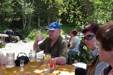 Den altersmäßigen Konditionstest hat aber Frau Pongratz aus Bayern mit ihren 92 Jahren und 2 Knieoperationen (Kniersatz) mit großem Vorsprung gewonnen. Bevor die Gruppe wegging fragte mich ihre Tochter noch ob es da einen kürzeren und weniger steilen Weg für sie auch gebe. Diesen erklärte ich ihr und bat Hans Stocker ihr die Stelle der Umkehr zu zeigen. Als die Gruppe dort hinkam suchte Hans Frau Pongratz um sie darauf hinzuweisen. Die gute Frau, eine ehemalige Sportlerin, war aber schon über alle Berge, mitten im doch sehr steilen Anstieg zur Ochsenalm und er musste Gas geben um sie noch einzuholen. Ich ziehe meinen Hut und beuge mein Knie vor dieser Dame, das verdient Respekt. So manche weitaus jüngere Dame könnte sich da ein Beispiel nehmen! Als die Gruppe oben ankam war sie eine der ersten die ich sah, mein Staunen war groß. Bei den Bildern vom Aufstieg können sie die extrem fitte Seniorin bewundern.