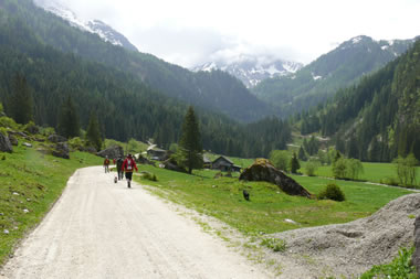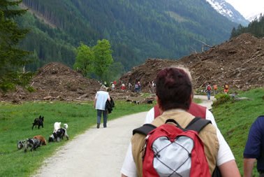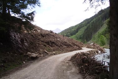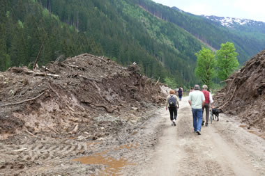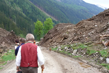 Bei leichter Bewölkung gingen wir, nach Erledigung der erwähnten „Kamalitäten“, letztendlich in langgezogener Kolonne entlang des Preuneggbaches die 4,85 km Richtung Moarhofalm. 2 Autos mit Teilnehmern die weniger gut zu Fuß waren fuhren mit dem Auto, nachdem wir die Absperrung entfernten, hinein. Im vergangenen sehr schneereichen Winter sind hier mehrere Lawinen ins Tal gerutscht. Eine dieser Lawinen wurde als „Jahrhundertlawine“ bezeichnet. Ursprünglich etwa 200 m lang und 17m hoch. Sie verschüttete nicht nur die Strasse, sie überquerte und verschüttete auch den Bach. Glücklicherweise teilte sich die Lawine dann und verschonte eine Jagdhütte in der sich zur fraglichen Zeit ein alter Jäger aufhielt. Als er Wild an seiner Hütte vorbeiflüchten sah, das Donnern der auf ihn zukommen Monsterlawine hörte, ahnte er schon seine letzte Stunde. Gott hat ihn noch davor bewahrt. Manche Menschen haben einen besonderen Schutzengel. Die Reste dieses Naturereignisses fanden wir noch rechts und links der Straße, einige Fotos zeugen davon.