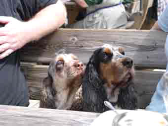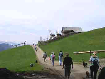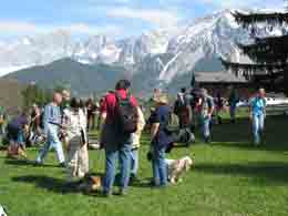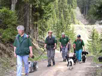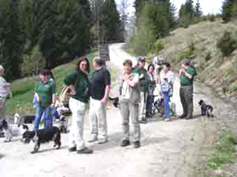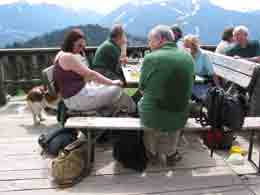 Trotz der sehr warmen Temperaturen und der vorhergehenden langen Nacht ging es schnell vorwärts. Leider verlor ein Cocker seinen Herrn und suchte etwas verwirrt umher, viermal konnten wir ihn wieder in Marschrichtung zu bewegen, beim 5.Mal lief er an uns vorbei ins Tal. Peter Hammerl und Rudi Parzer versuchten ihn einzuholen aber es war vergeblich. Über Funk riefen wir sein Herrchen der ihn wieder herauf holte. Herrchen und Hund hatten gute Kondition und waren bald wieder da. Leider wiederholte sich das Spiel bergab wieder, der Cocker machte sich wieder selbstständig und prüfte die Kondition seines Herrchens erfolgreich. Auch dieses Mal ging alles gut aus. Bei herrlichster Fernsicht und sehr warmer Temperaturen genossen wir unser Mittagessen und die Rast. Einige unterzogen die Bänke einer Belastungsprobe und ein im Schweiße seines Angesichts geplagter Präsident erholte sich am Tisch. Als ein Besucher mit einem Schäferhund die Terrasse der Sonnalm betreten wollte schlugen alle unsere Spaniels kräftig an und verscheuchten ihn wieder. Manchmal sind unsere Lieblinge richtige Rassisten, alles was kein Jagdhund ist wird verbellt.