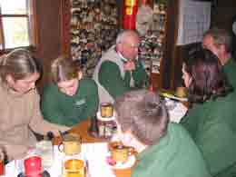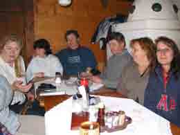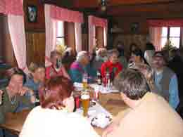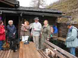 Die Brandalm liegt auf etwa 1600 m Höhe und ist sehr schön gelegen, leider fehlte uns die Fernsicht am Vormittag fast völlig. Beim Abmarsch vom Hotel Dachstein herrschte Schneetreiben das uns aber nicht aufhalten konnte. Außerdem waren Walter Hafner und ich ortskundig und auf diesem Weg kann man sich kaum verlaufen. Über Funk und Mobiltelefon erfuhren wir auch ständig die Position der 2. Gruppe mit Dr. Parzer. Wir mussten etwas langsamer gehen, weil bei uns die älteste Teilnehmerin mit 84 Jahren Frau Pongratz aus München mitging. Eine bewundernswerte Leistung, hat sie doch zum hohen Alter noch Beinprobleme, trotzdem nimmt sie Strapazen auf sich und hatte große Freude mit dem Erlebten. Wir freuten uns mit ihr.
