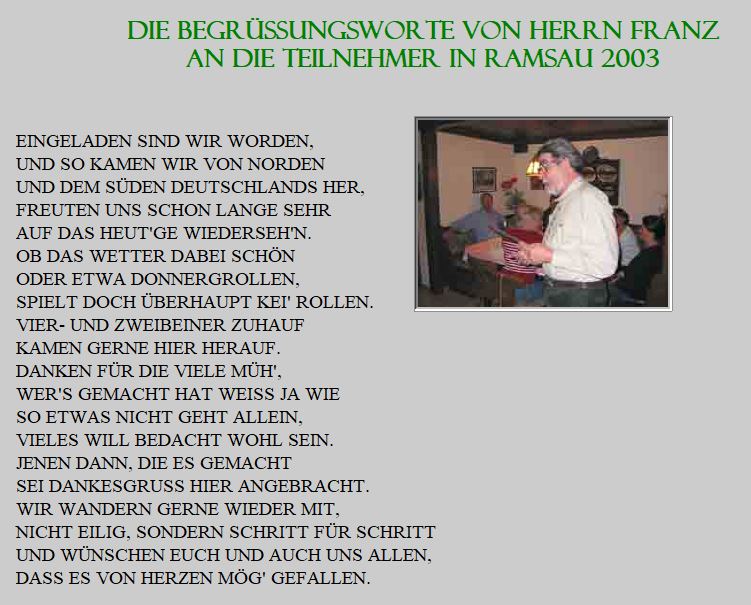 Zum 3. Mal trafen wir uns zu einem Wanderwochenende. Heuer war die LG NÖ/Bgld. als Organisator an der Reihe. Da die Teilnehmer 2001 bei der ersten Veranstaltung in Ramsau und im Zechmannhof sehr zufrieden waren, entschlossen wir uns wieder hierher zu kommen. Durch die gut organisierten vorherigen Veranstaltungen, und die Ankündigung in Schleching 2002, war der Andrang für Ramsau 2003 besonders groß. Angemeldet waren 90 Teilnehmer mit 76 Spaniels, 2 Teilnehmer mit ihren Cockern mußten leider kurzfristig absagen. Durch die große Teilnehmerzahl waren wir in 4 Häuser aufgeteilt, ein Teil war im „Zechmannhof“, der Großteil im Haus „Fichtenheim“, 11 Personen im „Haus Enzian“ und einige im „Haus Wiesenhain“. Abendessen war für alle im „Zechmannhof“.