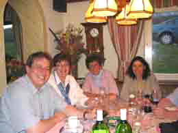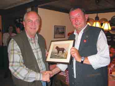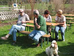 Schon beim Abendessen ging es lustig zu, die Begrüßung musste auf nachher verschoben werden, so dass die Leute in Ruhe essen konnten. Außerdem hört es sich mit sattem Magen besser zu, und bei knurrendem Magen der Zuhörer muss man lauter reden dass man gehört wird. Nach der Begrüßung durch den veranstaltenden LG Obmann Franz Reisner sprach der Präsident des DJSpKDr. Peter Beyersdorf einige Begrüßungsworte und dankte Obmann Reisner mit sehr netten Worten für die gute Organisation und überreichte ein von ihm geschriebenes Spanielbuch mit Widmung. Anschließend überreichte Dr. Beyersdorf an ÖJSpK Präsident Reinhold Brechtel ein sehr schönes Bild von einem Irish Water Spaniel als Gastgeschenk. Präsident Brechtel freute sich sichtlich über dieses Bild (er besitzt einen Irish Water Spaniel) und bedankte sich herzlich dafür. Wir sehen das auch als ein Zeichen der Vertiefung der deutsch-österreichischen Freundschaft der beiden Jagdspanielklubs. Im Anschluß bedankte sich Frau Dr. Franz die Leiterin der BG München des DJSpK bei Obmann Reisner für die Einladung und die Organisation und überreichte als Gastgeschenk eine Wasserspeiende Schildkröte für den Garten. Zum Abschluß trug Herr Franz ein selbst verfaßtes Gedicht vor, was im großen Beifall brachte.
