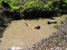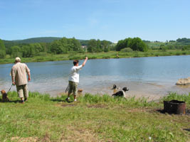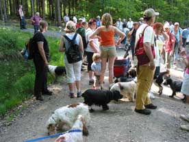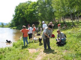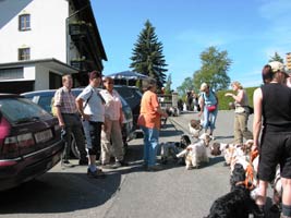 In der Mittagshitze mußten wir leider über Asphaltstraßen Richtung „Perlsee“ unserem Tagesziel gehen. Glücklicherweise wohnen im Ort Untergrafenried sehr nette und hundefreundliche Leute an der Straße die unsere Spaniels mit großen Mengen kühlen Wassers versorgten. Wir haben sie ins Abendgebet eingeschlossen. Veranstalterin Claudia konnte da sicher nichts dafür, das lag am Wanderführer, erging anscheinend lieber auf geteerten Wegen. Den Hunden und uns wären Waldwege, davon gibts ja hier genug, lieber gewesen. Trotz dieser Marscherschwerung kamen alle im Strandgasthof am „Perlsee“ an, wenn auch verschwitzt und mit großem Durst. Leider servierte die tschechische Kellnerin im Ostblocktempo und verlegte den Plan, mit einem Wort: Der fehlte die Übersicht! Ich wartete volle 40 Minuten auf 2 „Radler“, wohlweislich hatte ich gleich 2 bestellt, sonst hätte ich vermutlich einen 2. nie bekommen. Aber auch dieses Problem lag nicht am Veranstalter, es lag am Wirten. Nach der Mittagspause gönnten wir unseren Hunden ein verdientes Vollbad im See. Die Entfernungsangaben zum See stimmten mich allerdings etwas nachdenklich. Mir wurden 350 Meter gesagt. Was waren das für Meter? Oberpfälzische oder Niederbayrische? Wenn die den Ursprung von der Schrittlänge eines Mannes haben, müssen hier früher Riesen gewohnt haben. Gemessen in europäischen Metern war’s bis zum Wasser sicher ein ganzer Kilometer, wir gingen etwa eine Viertelstunde.