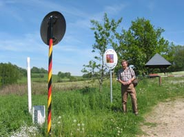 Die „Schnelläufer“ waren schon am gegenüberliegenden Hügel, wie am mittleren Bild in der 2. Reihe zu sehen ist, als die letzten erst am Waldesrand ankamen und ausschnauften. Was trieb die „Schnellläufer“, der Durst, der Hunger oder mußten sie einen Zug erreichen? Warum’s manche so eilig haben wird mir immer ein Rätsel bleiben. Dabei war der Wald und die ganze Gegend wunderbar anzuschauen, gesehen können die „Gausterer“ davon nicht sehr viel haben. Da war mein Platz am Ende der Gruppe als „Besenwagen“ und „Aufklauber“ schon beschaulicher. Gesehen habe ich viel schöne Natur, geschwitzt habe ich sicher nicht weniger, und hetzen liegt mir sowieso nicht. An der grünen Grenze zur Tschechei war ich auch mit meiner Kamera und meiner Schlußgruppe um einen deutschen Präsidenten (DJSpK) am Schlagbaum zu fotografieren. Vor 1989 wäre dieses Foto ohne Verhaftung sicher nicht möglich gewesen.