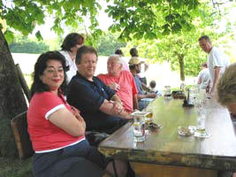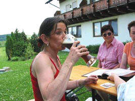 Auf jeden Fall ging’s am Sonntag auch lustig zu. Frau Fuhrmann, sonst kein Bier trinkend, wurde überredet eine dunkle „Weiße“ zu trinken. Selbstverständlich wurde dies´ bildlich festgehalten, es brachte ihr den Spitznamen „Bierfuhrfrau“ ein. Sie nahm es mit Humor, wie alle die hier anwesend waren, humorlose Menschen hatten keinen Zutritt. Gelacht wurde an diesem Wochenende sehr viel, vielleicht auch weil mir bei dieser Stimmung so manche „Wuchtel“ (ulkige Meldung) einfiel, was mir im allgemeinen ja nicht schwer fällt.