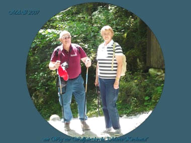 Ein „Oberschwitzer“, wie ich einer bin, verliert bei so einer Wanderung und so sommerlichen Temperaturen (bis zu 34°) allerhand an Flüssigkeit. Dies anscheinend wissend kam uns Reiner Fein – er war mit seiner Frau Claudia und Doris Evans schneller (weil auch jünger als meine Begleiterin und ich) – mit einem Bier in der Hand auf den letzten hundert Metern entgegen. Einem durstigen Gesellen wie mir erschien er wie der Erzengel Gabriel. Ich freu‘ mich immer wenn ich Reiner seh‘, diesmal war die Freude noch größer.