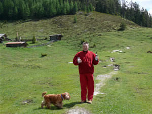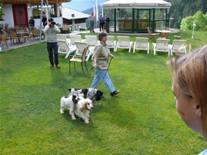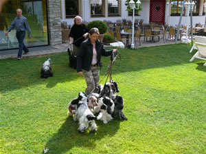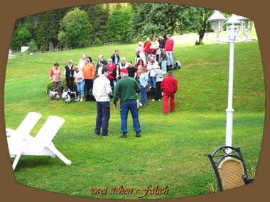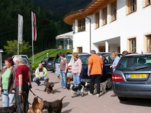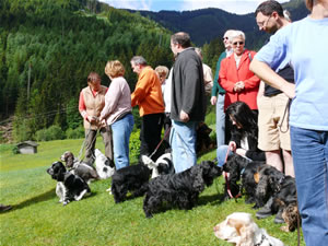 Als ich am Donnerstag bei strömenden Regen in Zell ankam und von Maria Luise Doppelreiter begrüßt wurde konnten wir nur hoffen dass die Wettervorhersage stimmt. Es wurde Sonnenschein und Hitze prognostiziert, ich dachte schon wer’s glaubt wird selig. Als es um 23 Uhr noch in Strömen regnete glaubte keiner mehr an Wetterbesserung. Das sehr gute und umfangreiche „Pinzgauer Bauernbüfett“ im „Hotel zur Seilbahn“ ließ uns das miese Wetter draußen aber schnell vergessen. Nach der Begrüßung durch MLD teilte uns Wanderführer Heinz Fuchs mit was wir – geeignetes Wetter vorausgesetzt – am nächsten Tag unternehmen wollen. Für die „Sportgeher“ eine längere Tour im Raum Saalfelden unter Führung von ihm selbst, für die „Gemütlicheren“ eine Wanderung zum Ritzensee unter Führung seiner Frau Elvira. Wer beides nicht wollte hatte den Tag zur freien Verfügung. Doch vor der Abfahrt zu den Wanderungen musste um 9 Uhr – im Auftrag des ÖJSpK Präsidenten – ein Gruppenfoto gemacht werden, eine lustige Angelegenheit wie sich herausstellte die auch eine Bilderserie verdient hat. Warum lustig? Weil um diese Zeit noch sehr viele, vor allem Spätaufsteher, noch beim Frühstück saßen oder mit ihren Hunden zum „Lackimachen“ unterwegs waren. Obwohl nur 48 Menschen mit etwa gleich vielen Hunden aufzustellen waren glaube ich dass zum Foto nicht alle erschienen waren, zumindest erweckte es den Eindruck. Sie können ja in der nächsten „PRO SPANIEL“ nachzählen. Bis der Profi-Fotograf seine Bilder machen konnte dauert es eine ganze Weile, diese Zeit nutzte ich meinerseits für Fotos um den „Aufmarsch“ zu dokumentieren.