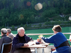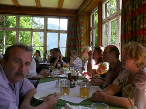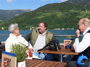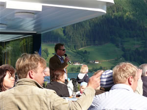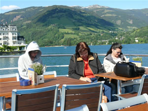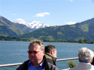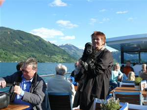 Um 16,30 Uhr fuhren wir vom Hotel zur Schiffsanlegestelle. Durch eine etwas „mißglückte“ Schilderung des Anfahrtsweges wurde daraus eine unfreiwillige kleine Stadtrundfahrt. Wir erreichten aber trotzdem pünktlich aber knapp das Schiff. Bei unserem letzten Wanderwoche 2004 in Zell am See hatten wir weniger freundliches Wetter bei der Seerunde. Diesmal, bei Traumwetter, saßen wir am Oberdeck und genossen den Ausblick auf die herrliche Gegend, leider nahmen nur verhältnismäßig wenige Spanielfreunde daran teil. Sie haben etwas versäumt. Herr Daxer, unser Hotelchef, erklärte uns die umliegende Gegend und wer und wo von der in Zell am See reichlich vorhandenen Prominenz wohnt. Ab 19 Uhr gab’s Abendessen (Galadiner) da waren wir wieder vollzählig – auch die Nichtwanderer und Nichtschifferlfahrer – pünktlich zur Stelle. Beim Essen machen immer alle mit, warum nicht bei den Veranstaltungen?